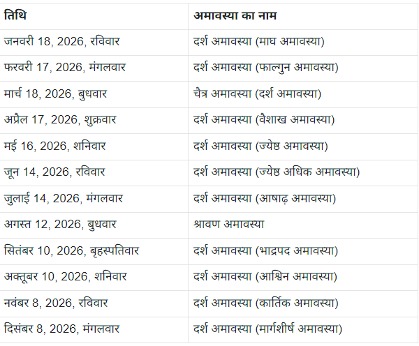 2026 में पड़ने वाली अमावस्या तिथि लिस्ट