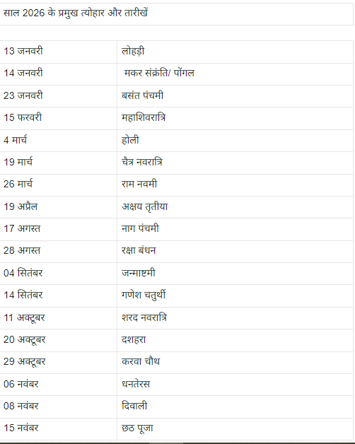 साल 2026 के पहले महीने यानी जनवरी की 14 तारीख को मकर संक्रांति का त्योहार मनाया जाएगा। फिर इसके बाद बसंत पंचमी का पर्व 23 जनवरी, शुक्रवार को है। इस वर्ष 01 फरवरी को महाशिवरात्रि, 04 मार्च 2026 को होली, 19 मार्च से चैत्र नवरात्रि आरंभ होंगे। 26 मार्च को राम नवमी का पर्व मनाया जाएगा।